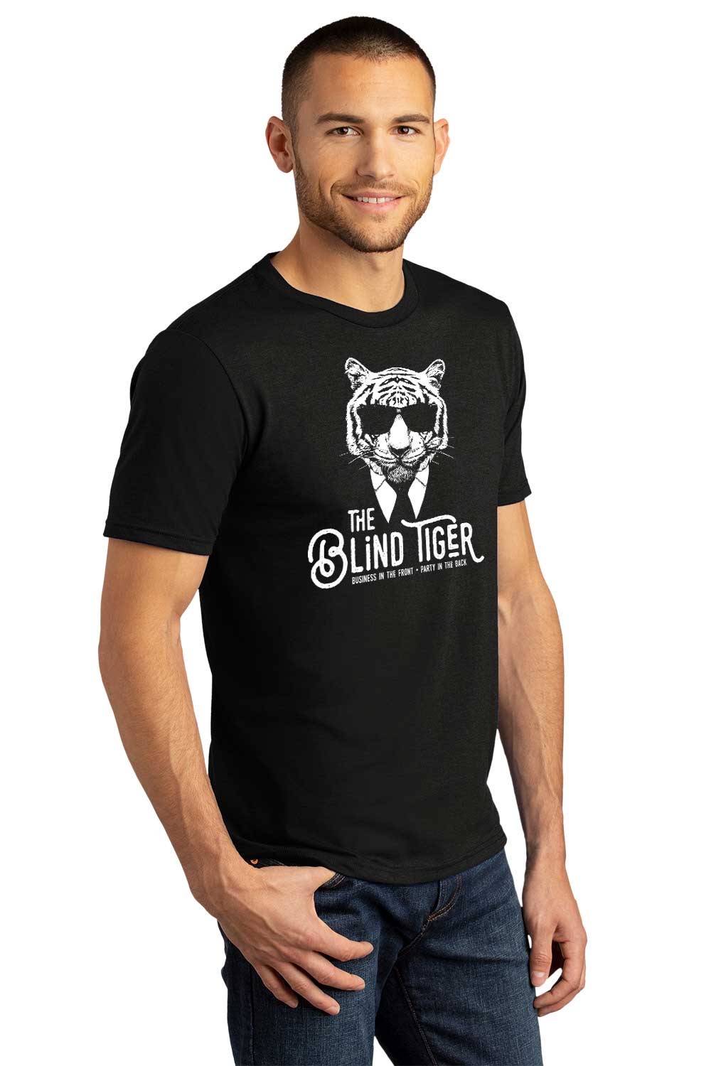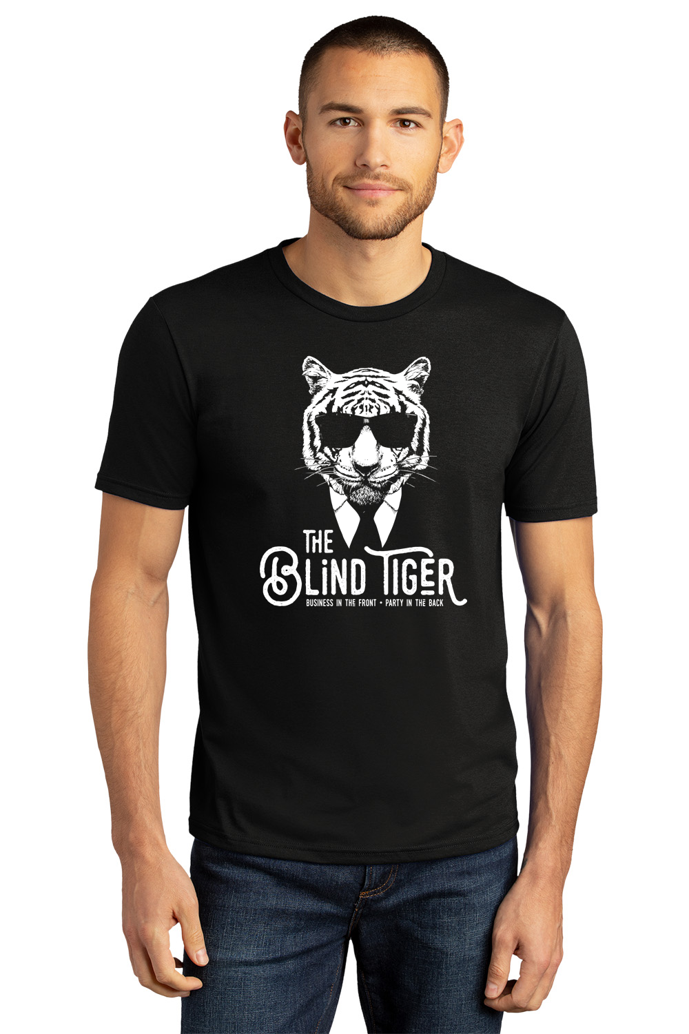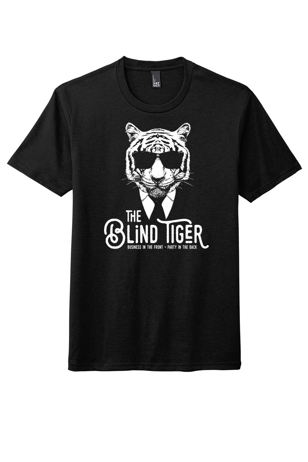 Elevate your wardrobe with The Blind Tiger Original "OG" T-shirt—a timeless piece that embodies both sophistication and edge. This black tee features the iconic white graphic of a tiger rocking shades and a sharp suit, perfectly capturing the spirit of The Blind Tiger community. The bold "The Blind Tiger" logo, paired with the tagline "Business in the front • Party in the back," delivers a statement that speaks to those who value quality and attitude.