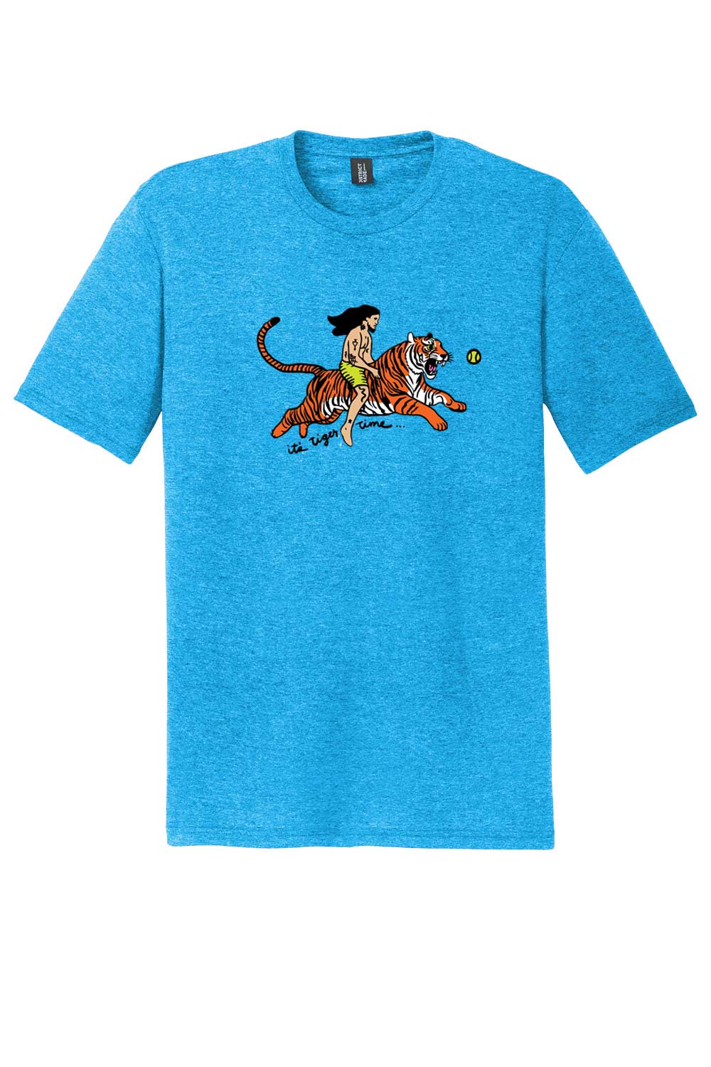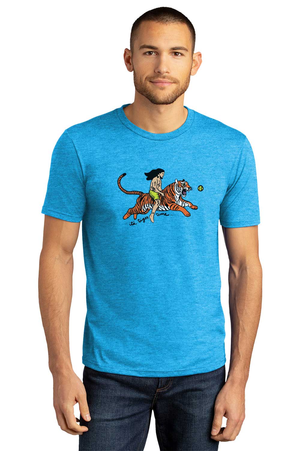 Get ready to unleash your wild side with the "Tiger Time" T-shirt! Featuring a bold and playful graphic of a man riding a tiger in pursuit of fun, this shirt serves as a reminder that it’s time to stop what you’re doing and enjoy life. Printed on a vibrant turquoise frost shirt, this design pops with energy and excitement, making it the perfect choice for adventurous spirits.