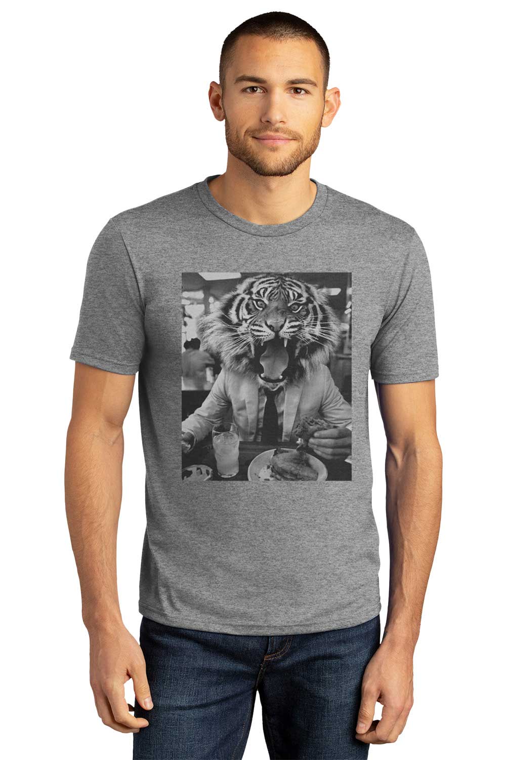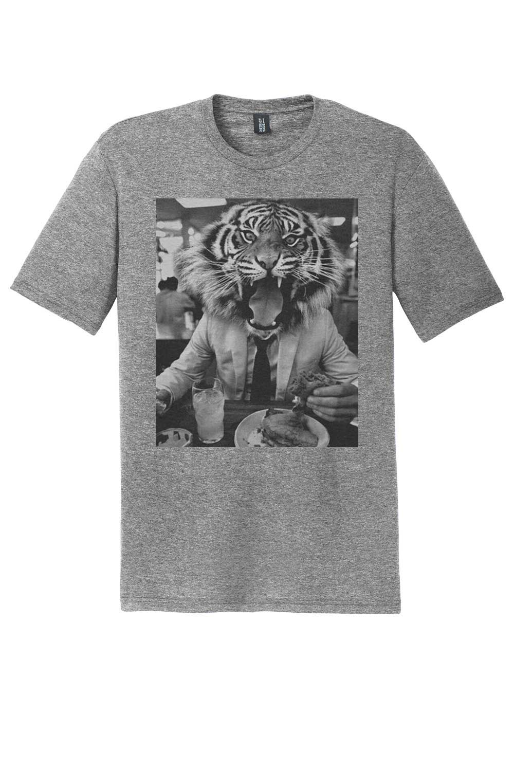 Make a statement with the Tigers Who Lunch Graphic Tee, a bold and stylish addition to your wardrobe. Printed on a heathered gray Frost T-shirt, this design features a striking black-and-white graphic of a tiger in a sharp suit, caught mid-bite at the table. The image blends sophistication with raw, untamed energy, perfectly capturing The Blind Tiger’s signature vibe.